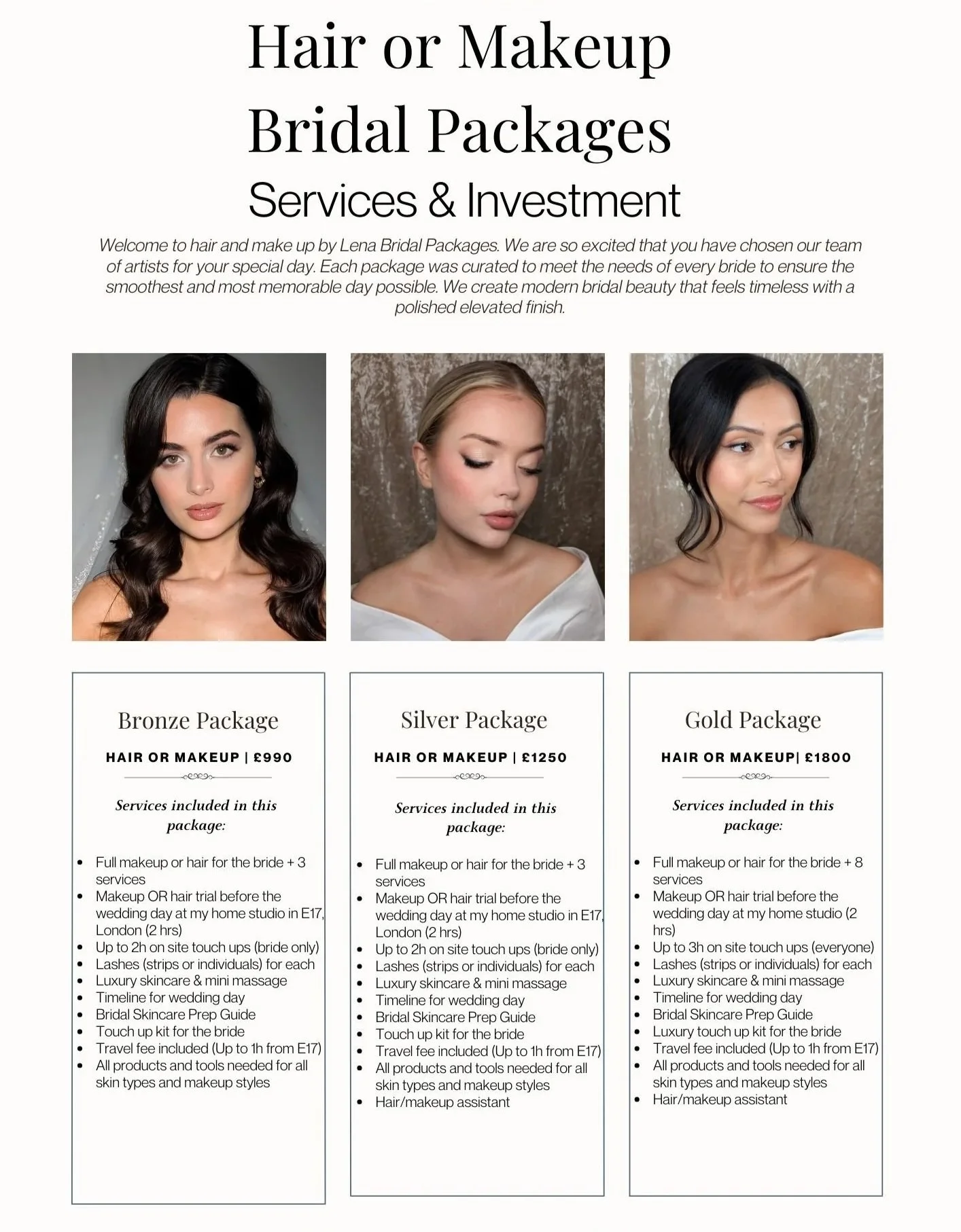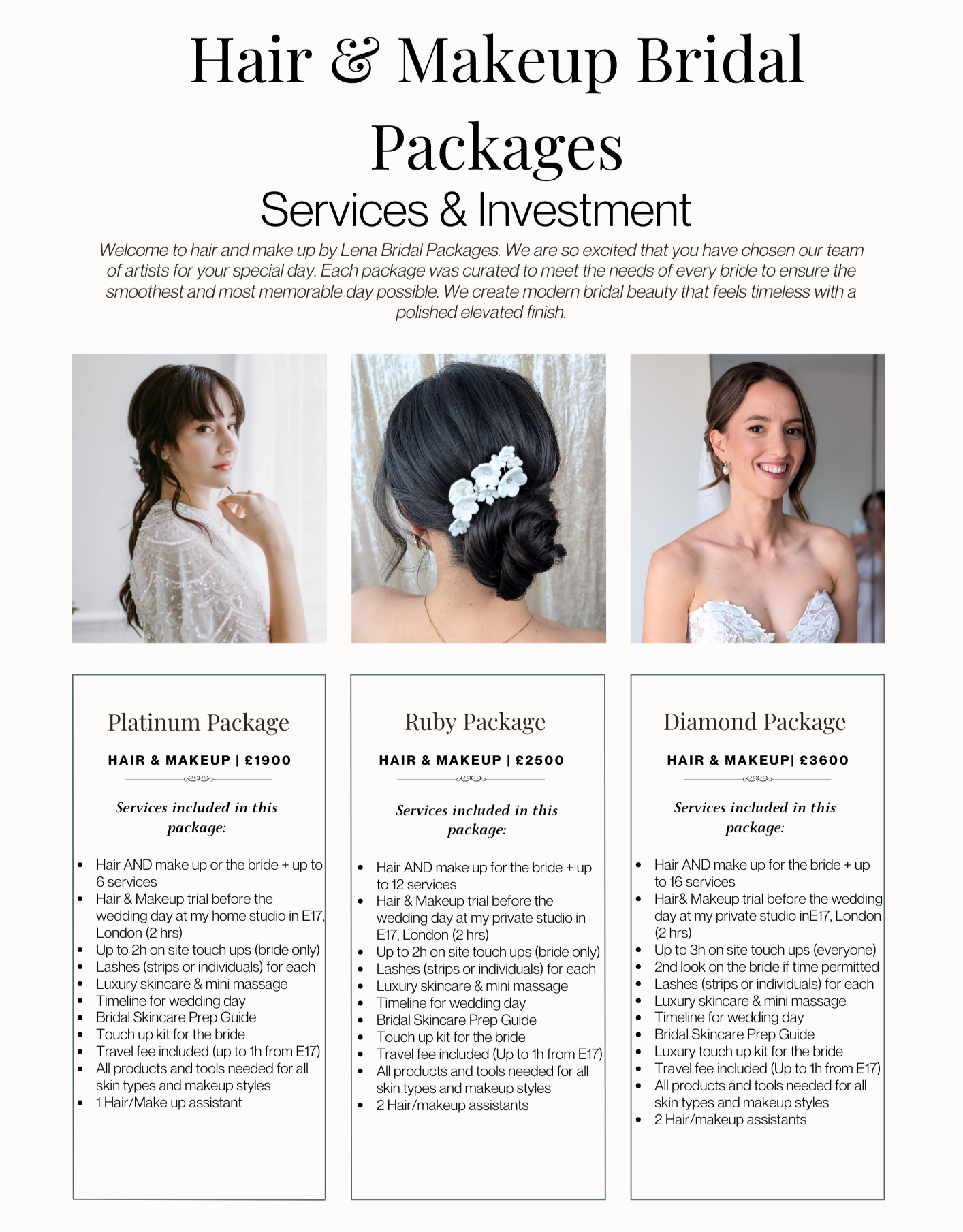 Welcome to hair and make up by Lena Bridal Packages. We are so excited that you have chosen our team of artists for your special day. Each package was curated to meet the needs of every bride to ensure the smoothest and most memorable day possible. We create modern bridal beauty that feels timeless with a polished elevated finish.